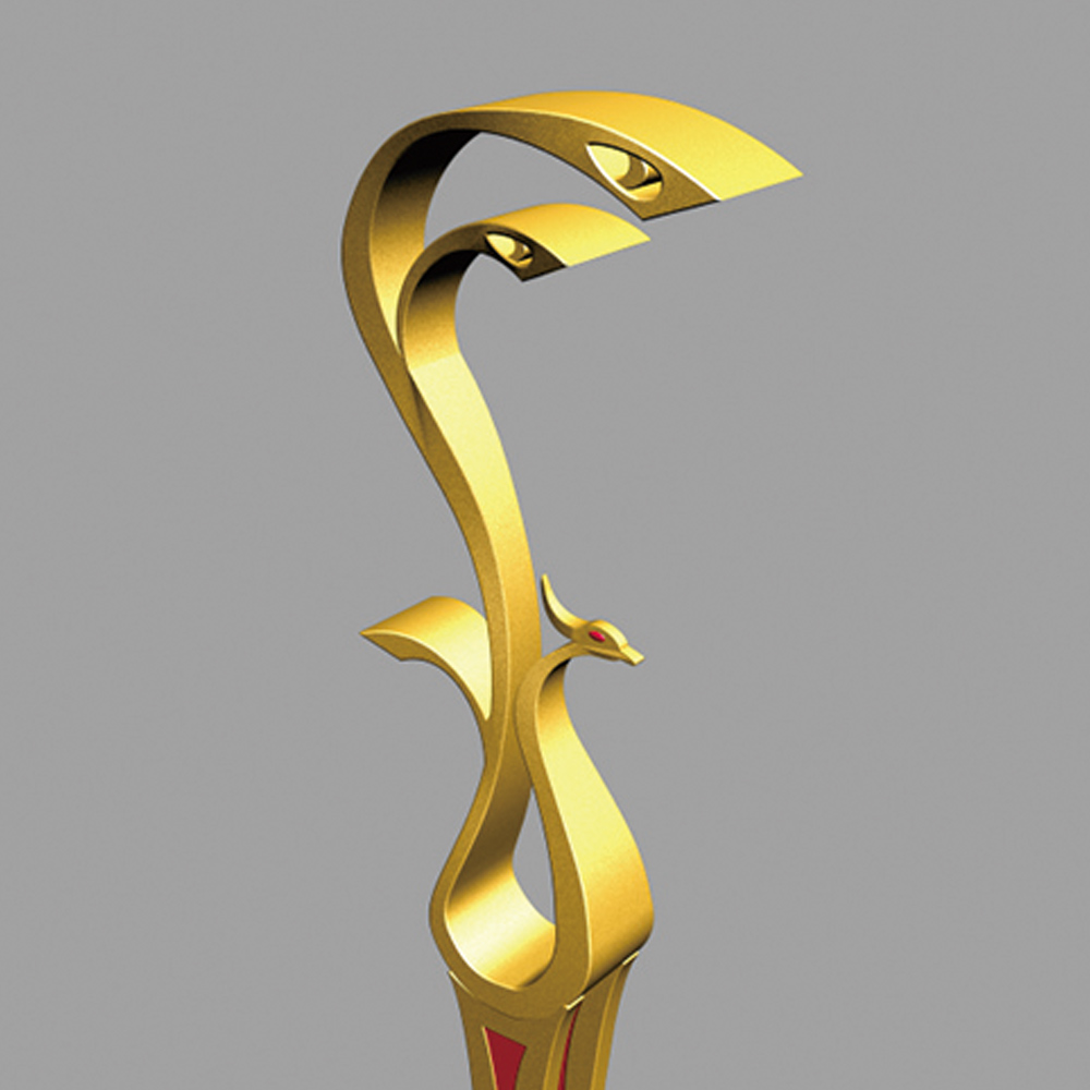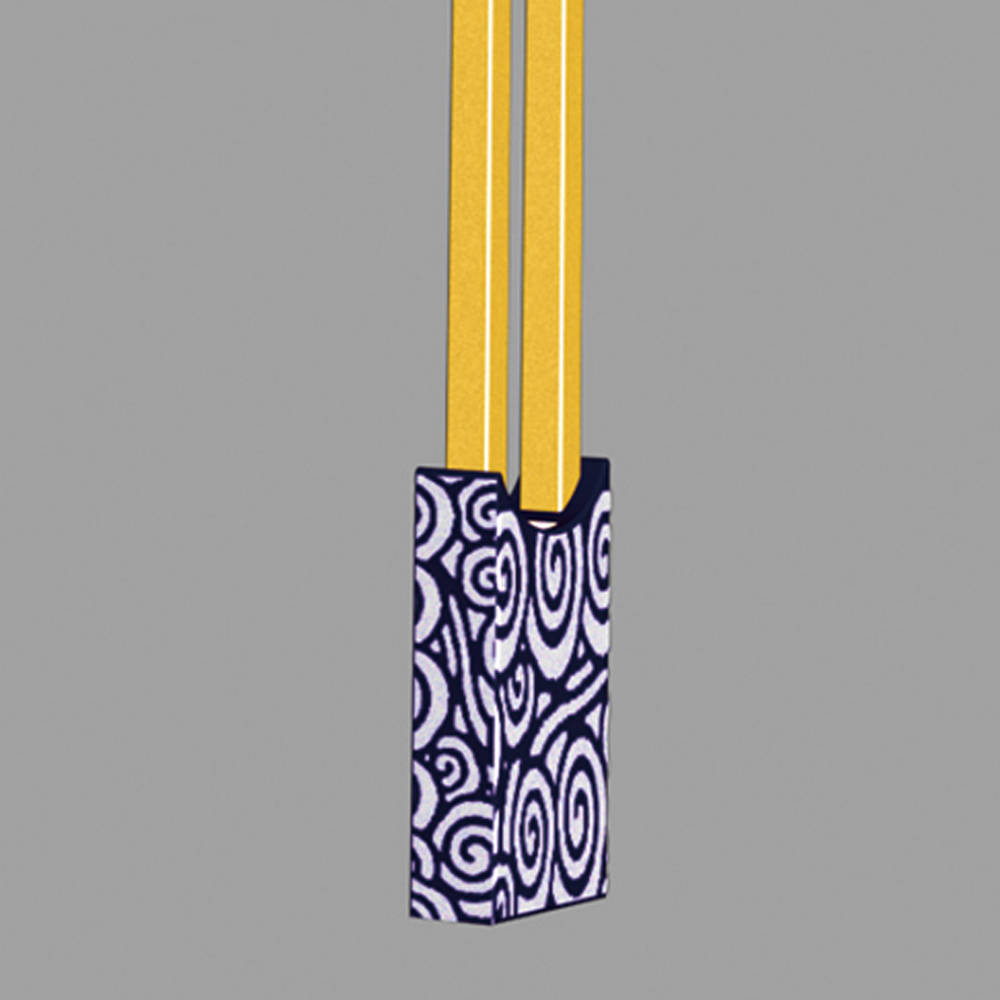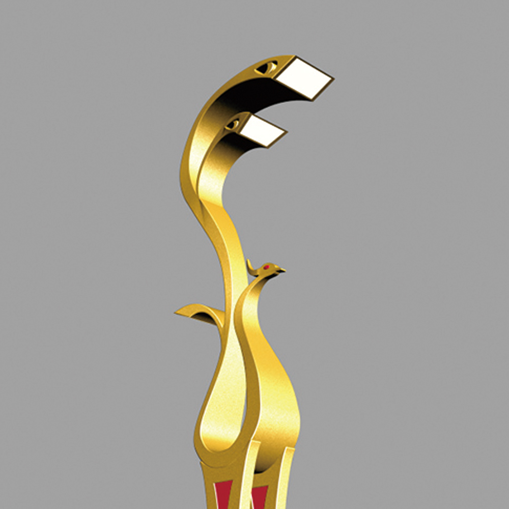 燈型上部為鳳凰的流線簡化樣式,桿體采用夸張的手法表現(xiàn)鳳凰的腳腿,底座用強(qiáng)烈的對(duì)比方式,以藍(lán)、白相間的“祥云”紋飾來表現(xiàn)鳳舞九天的藝術(shù)效果;